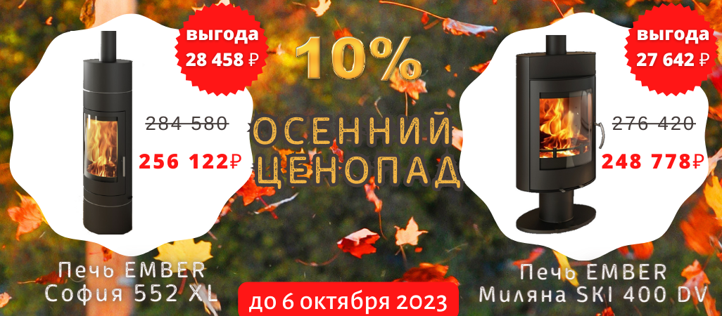В период с 22.09.2023 по 06.10.2023г. на печи Миляна SKI-400 и София 552 XL действует дополнительная скидка 10%!