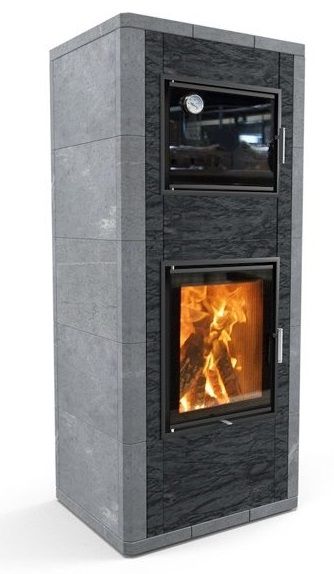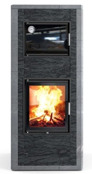 Печь-камин Heritage IV оснащен стальной топкой Нeritage подового горения. Топка футерована шамотом и имеет регулируемую мощность 9-13 кВт. Над топкой располагается большая духовка из нержавеющей стали с подовой керамической плитой и термометром, показывающим температуру внутри. Жаропрочное стекло позволит наблюдать за процессом приготовления пищи и горящими поленьями. Камень на фасаде камина обработан по специальной технологии в сочетании с гладкой поверхностью талька